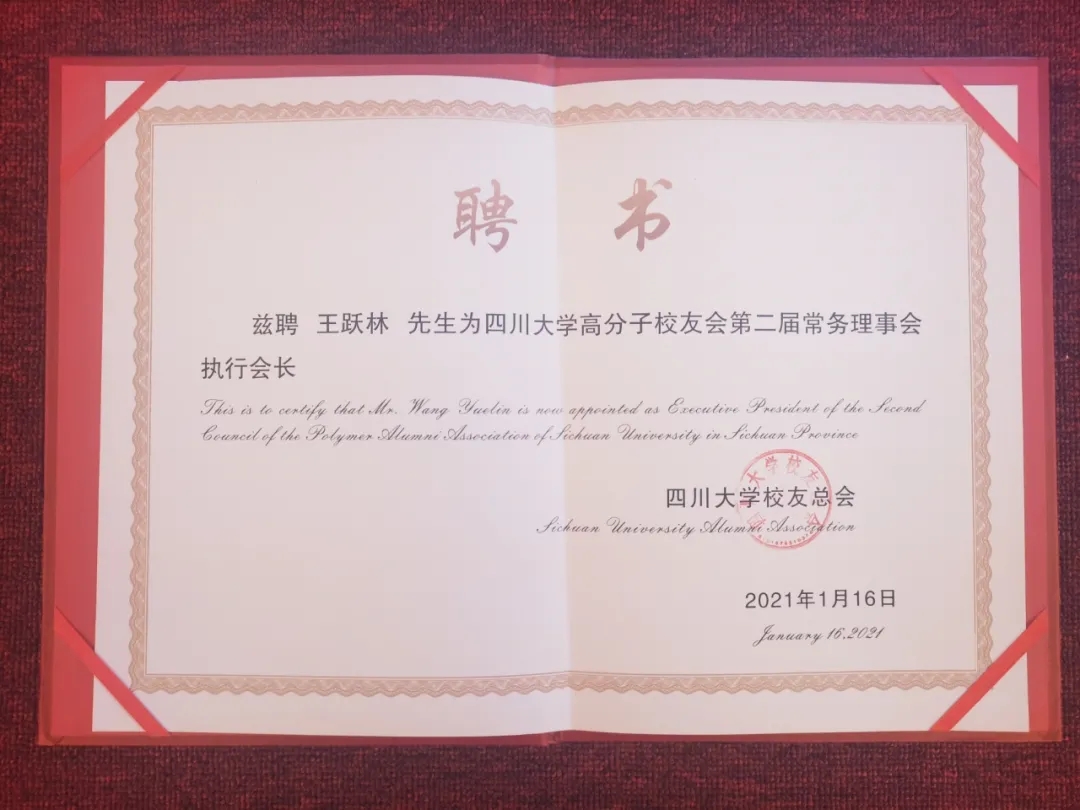 王跃林博士表示,当选川大高分子校友会执行会长,他深感责任重大、使命光荣,他将竭尽全力为校友会做好服务、行使担当。让校友会成为高校成果的“搬运工”;进一步扩大川大高分子在学术界、产业界的覆盖面和影响力;不断增强校友企业间联系,实现优势互补、双向赋能;利用校友会优势加强企业与政府沟通和交流、协作与链接,共同推进川大高分子校友会建设,助力四川大学高分子学科蓬勃发展、行稳致远,为四川大学建设世界一流的高分子学科注入不竭动能,凝聚磅礴力量。